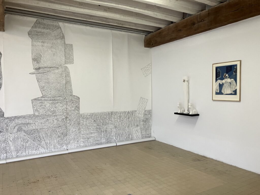 Richard Fauguet, comme Max Ernst, est aussi le poète de l’assemblage graphique et sculptural. Pour cette réalisation murale, l’artiste s’est inspiré du triptyque de sculptures monumentales en pierre, Corps enseignant pour une école de tueurs, produit par Max Ernst à Huismes en 1967. Et plusieurs de ses sculptures récentes en plâtre complètent l’exposition.